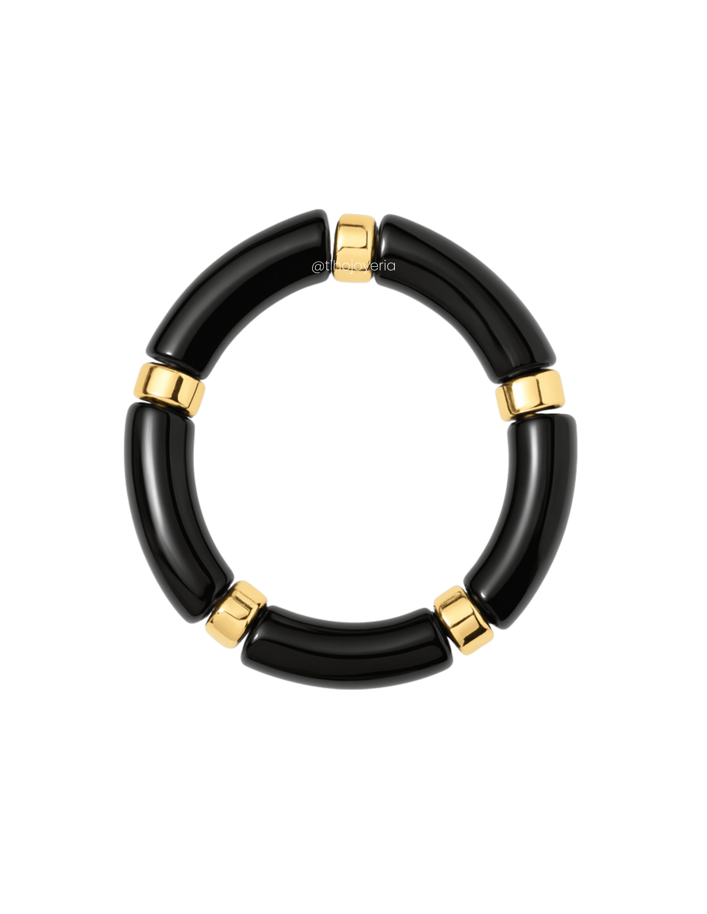 Con un diseño de piezas negras esmaltadas y detalles dorados, este brazalete es sinónimo de sofisticación. Perfecto para darle un aire contemporáneo y chic a tus looks de noche o para elevar un outfit casual con un toque de lujo.