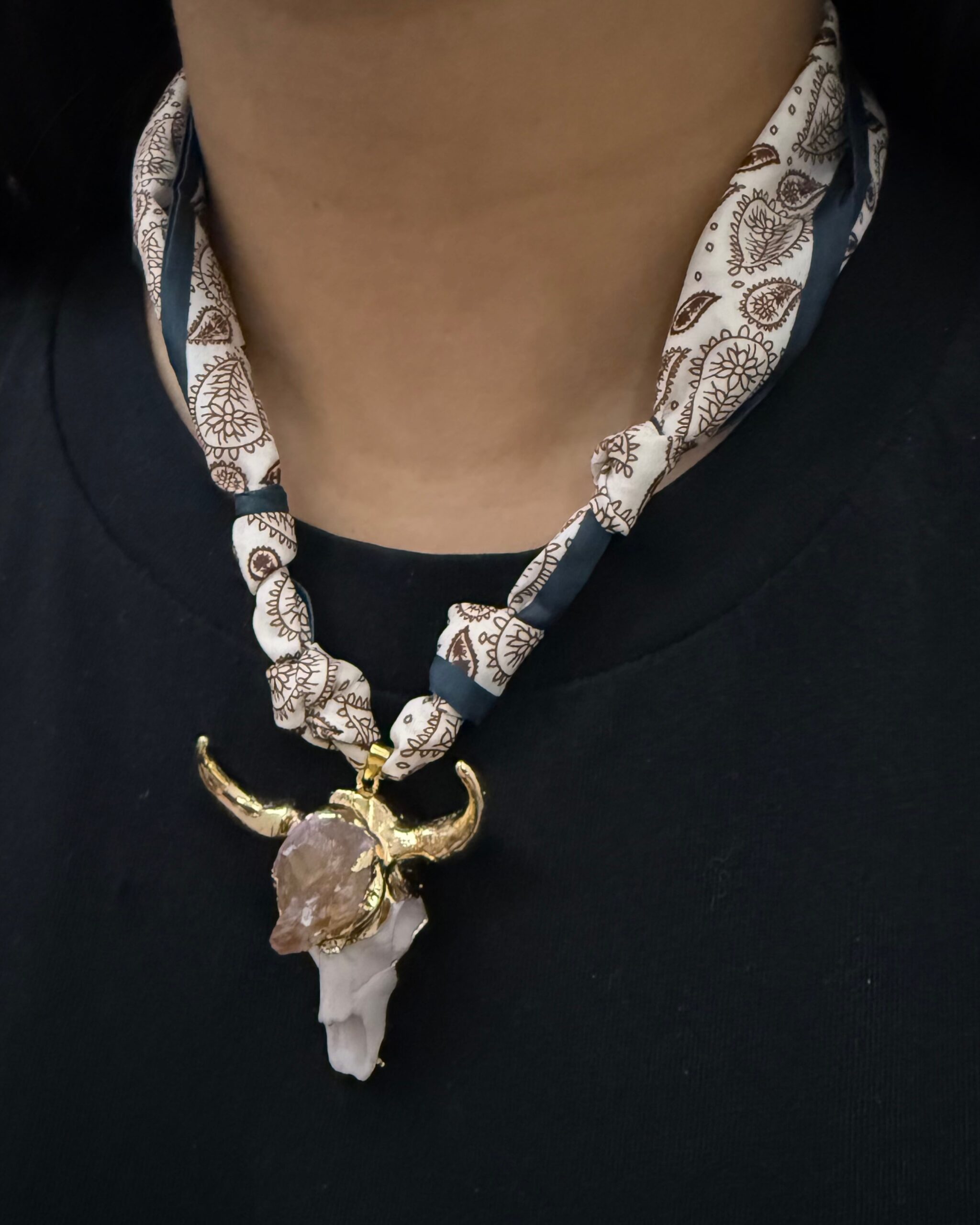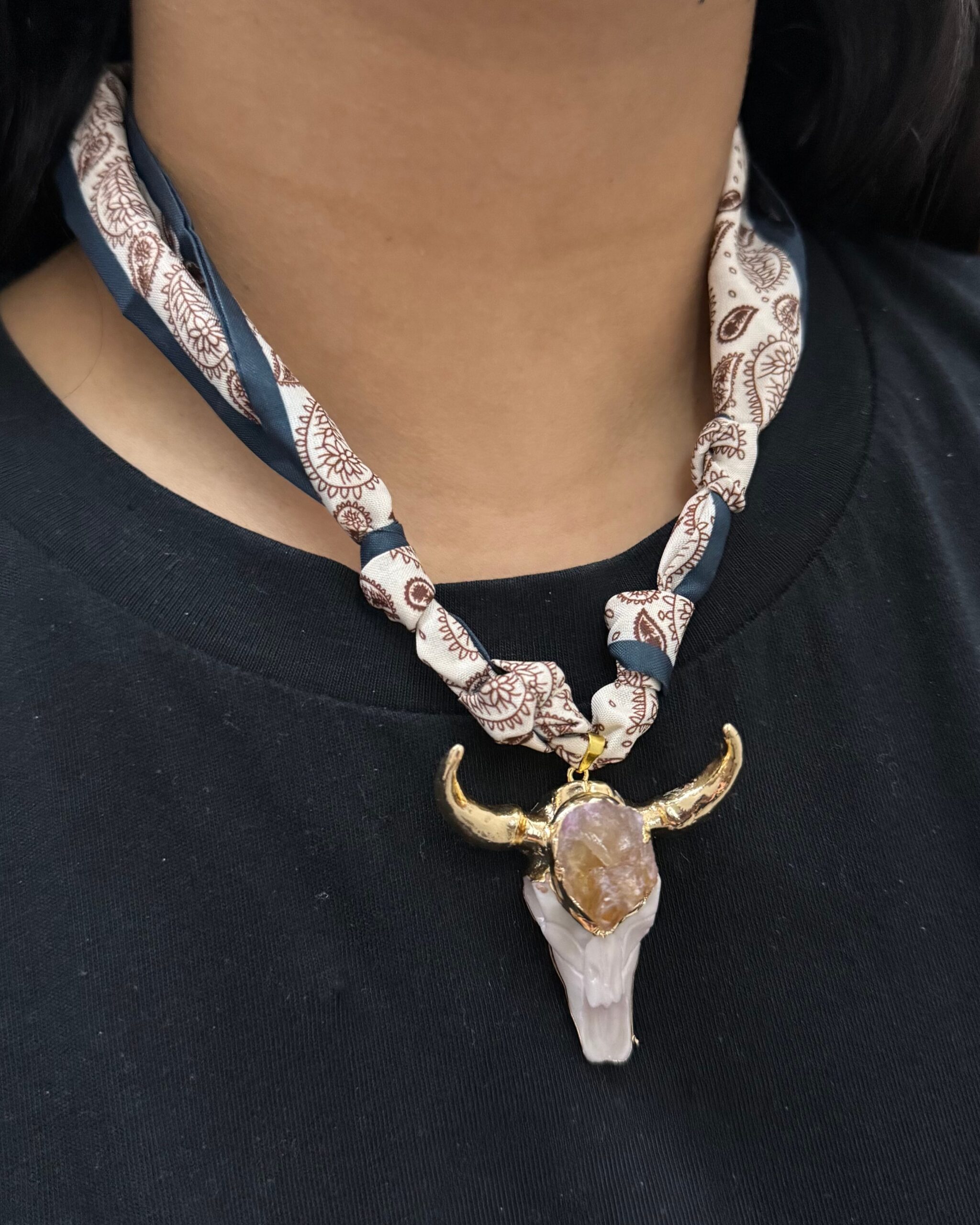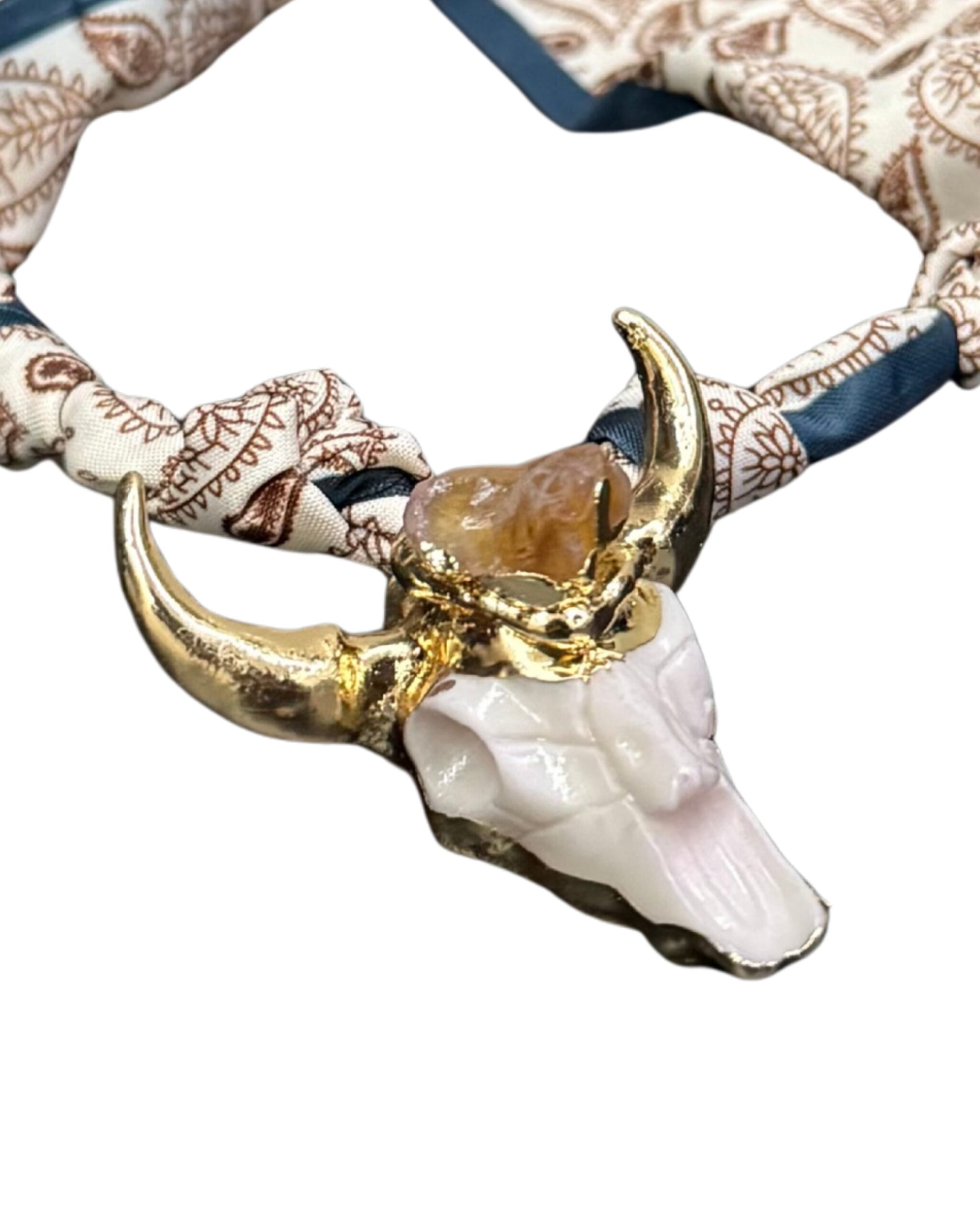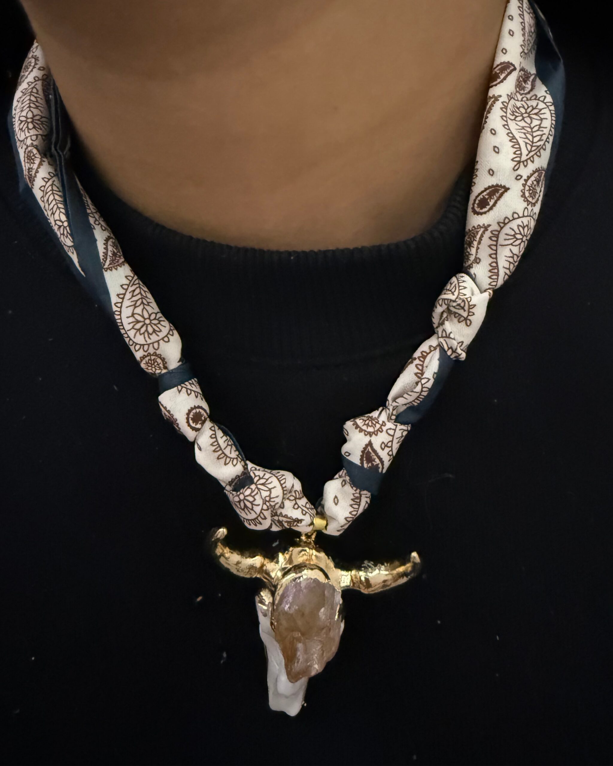 Atrévete a destacar con este collar único, donde la elegancia se fusiona con la energía indomable del toro. Su dije dorado de toro, adornado con un paliacate chic, representa coraje, determinación y estilo auténtico.