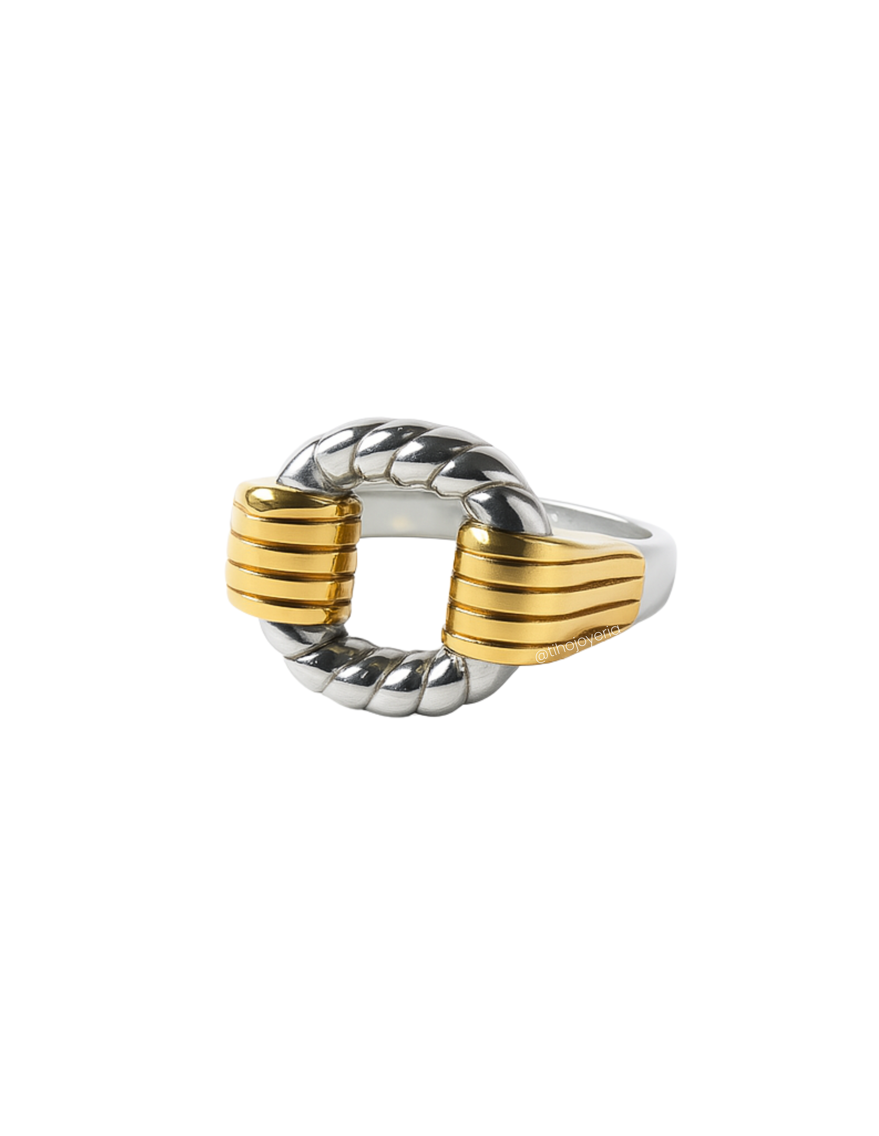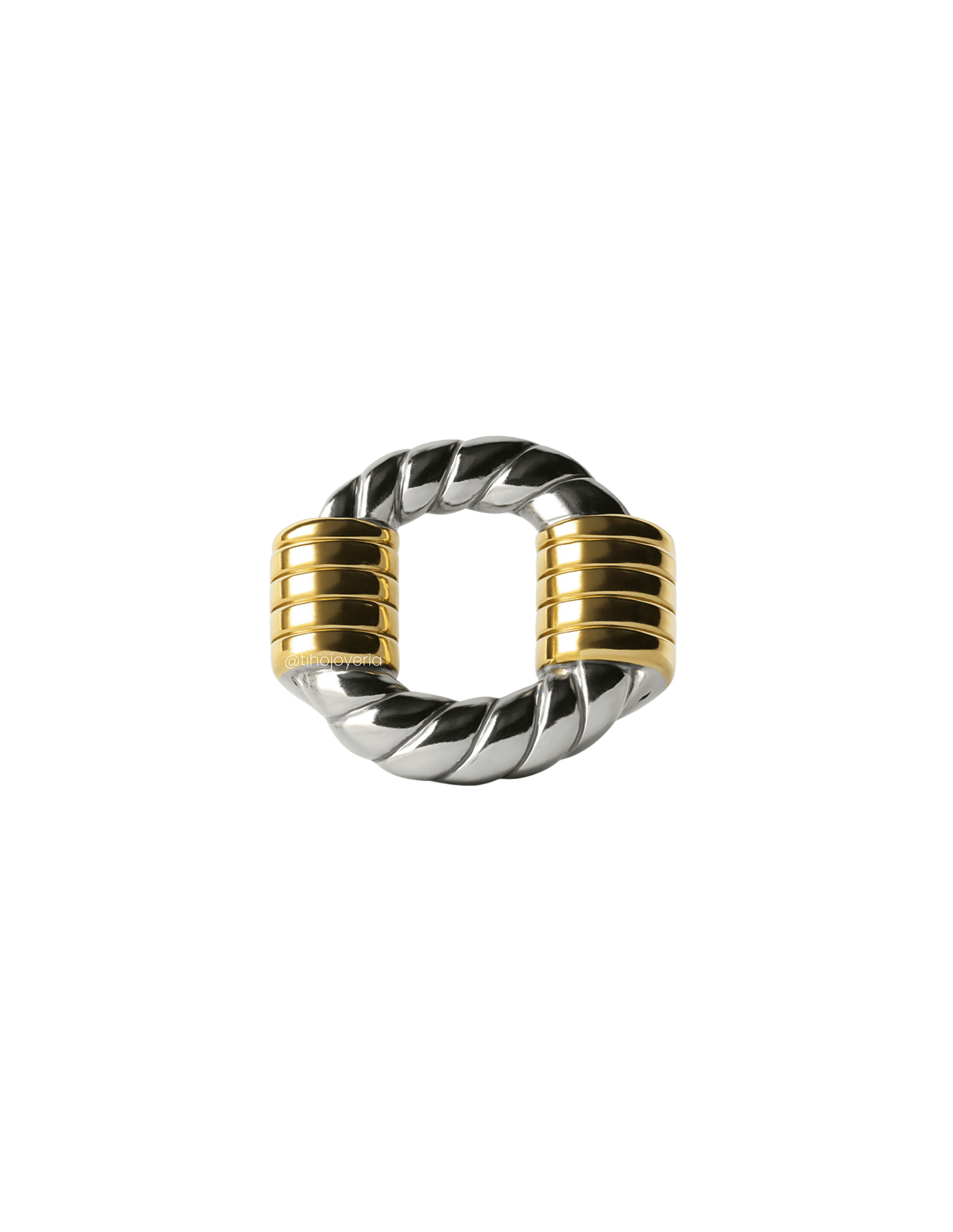 Fusión perfecta entre lo industrial y lo elegante. Con un cuerpo trenzado en acabado plateado y abrazaderas doradas que evocan fuerza y estructura, esta pieza se convierte en un símbolo de conexión, equilibrio y carácter.