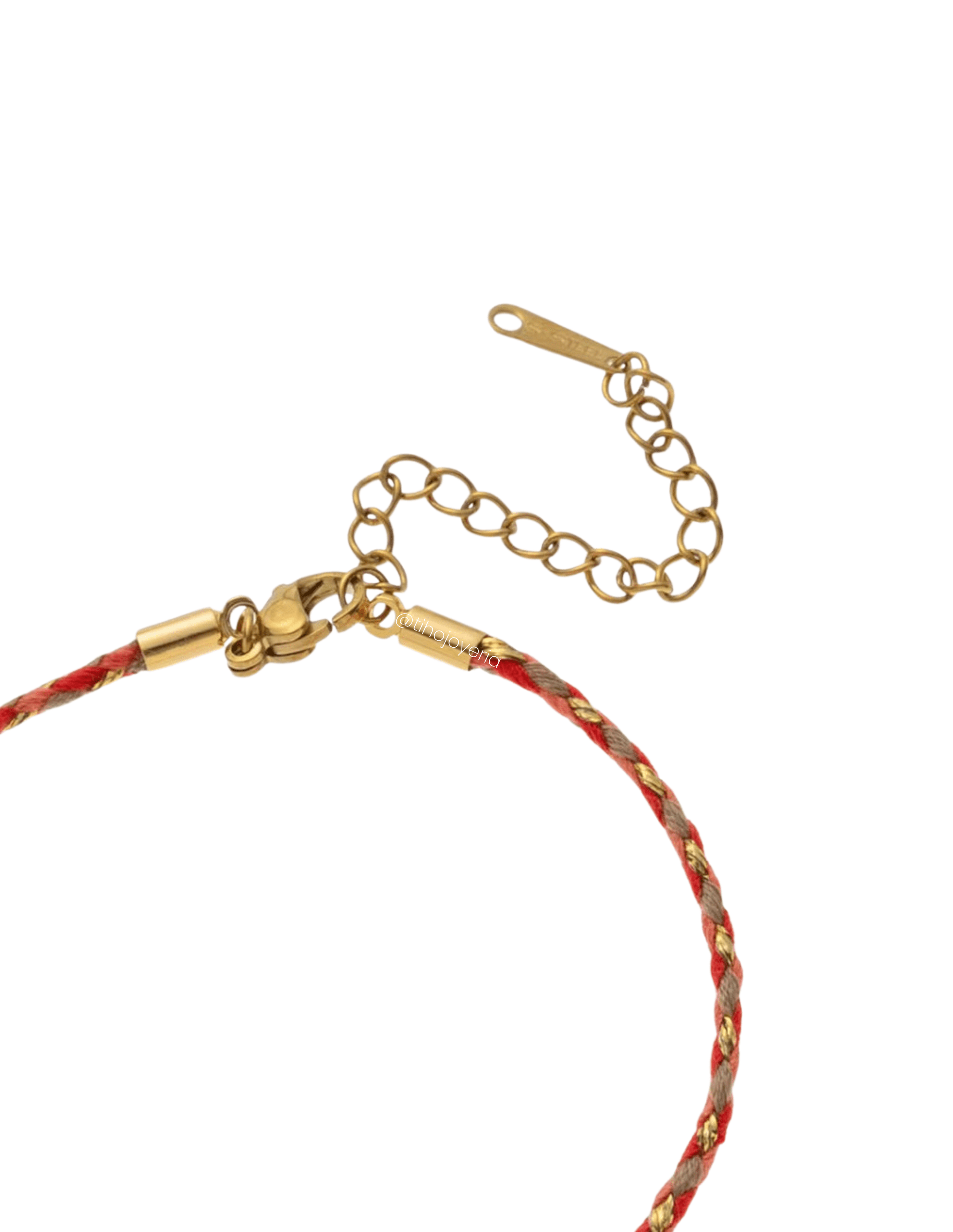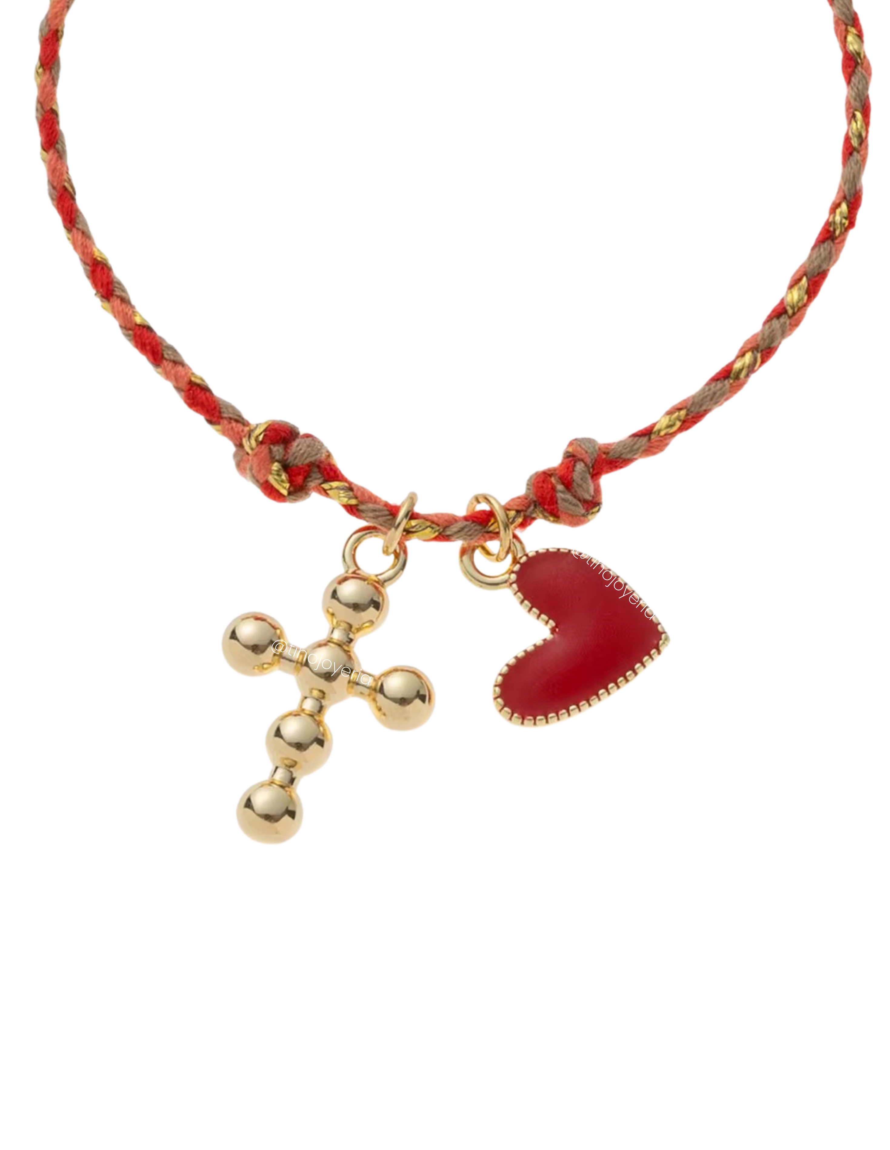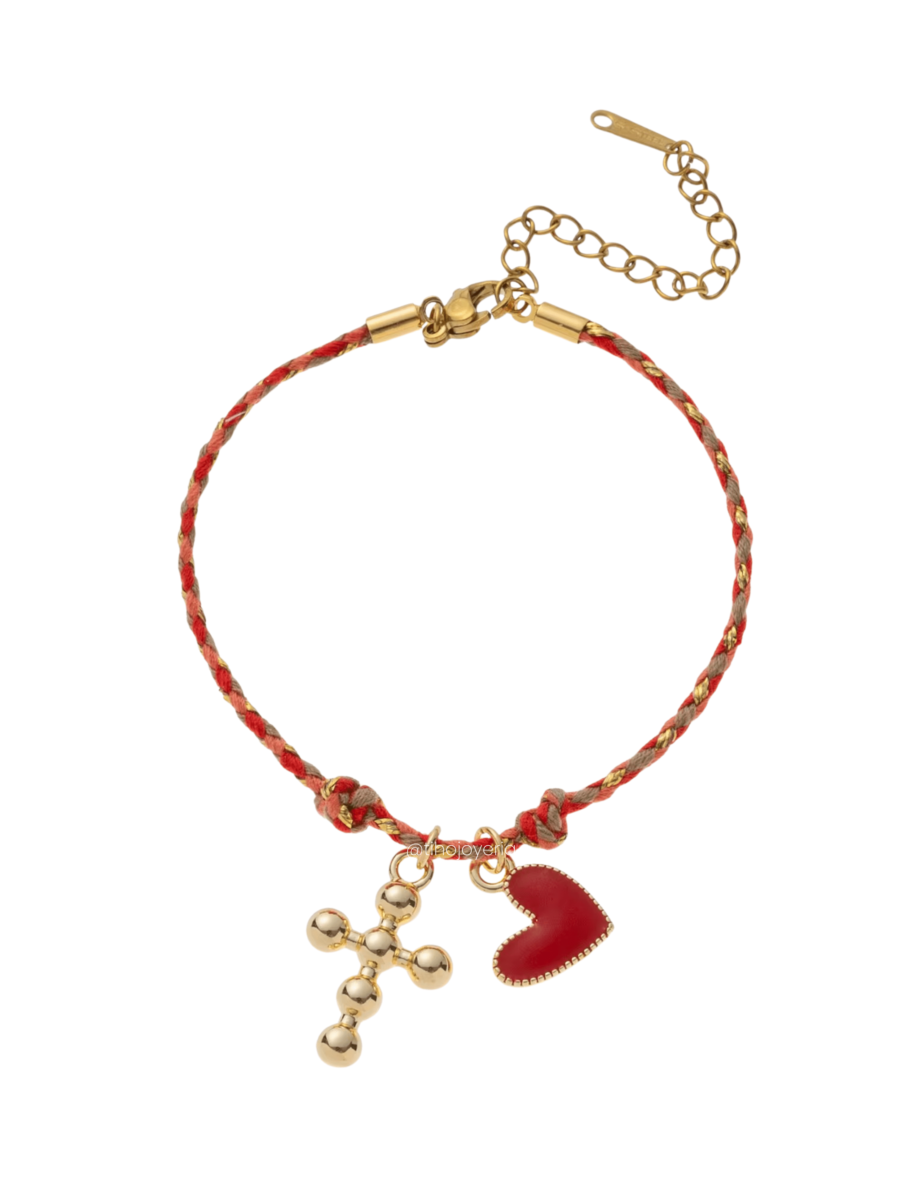Un diseño que combina lo espiritual y lo romántico. La cruz de esferas doradas aporta un aire elegante, mientras que el corazón rojo añade un toque de pasión y color. Combínalo con accesorios minimalistas o con un look monocromático para hacerlo resaltar.