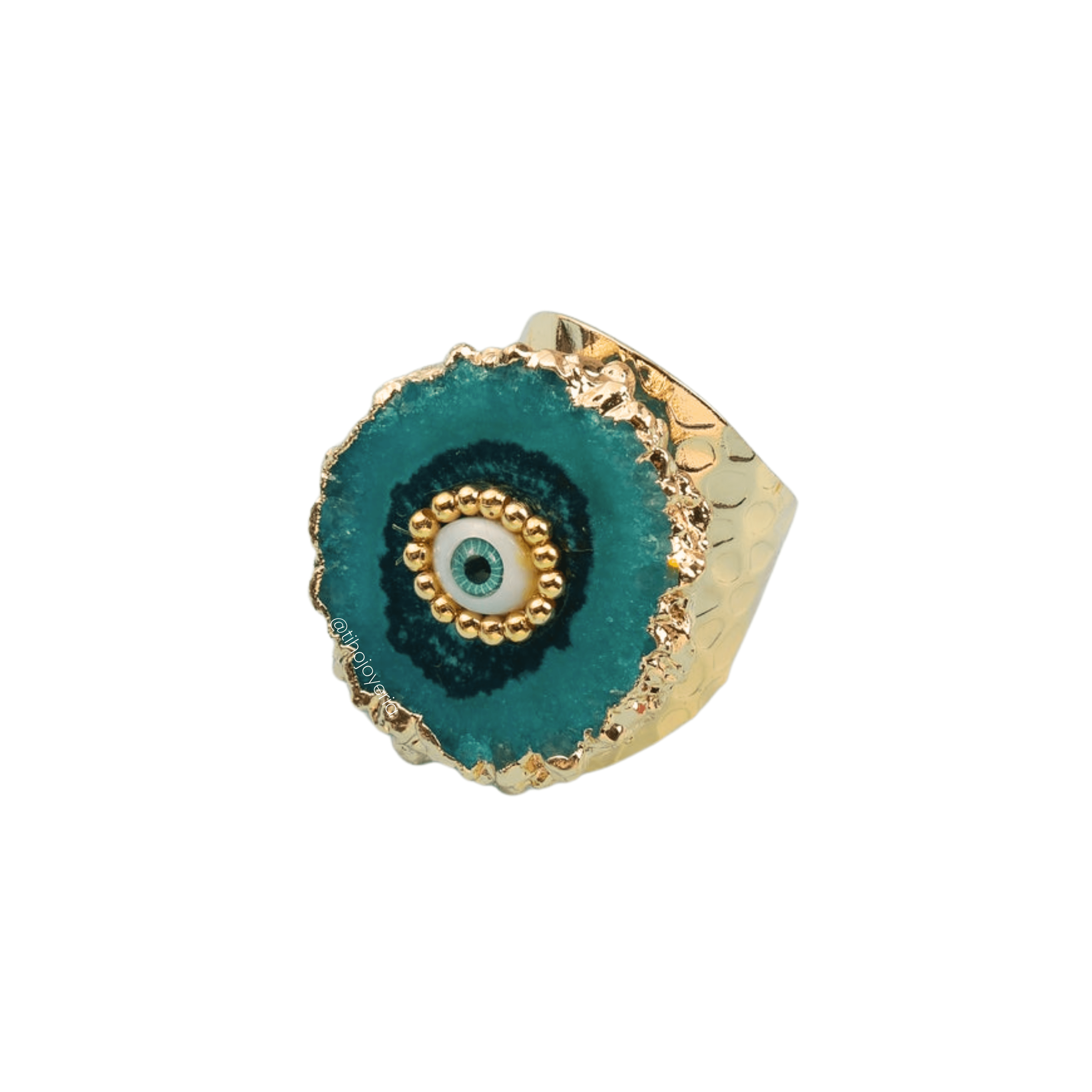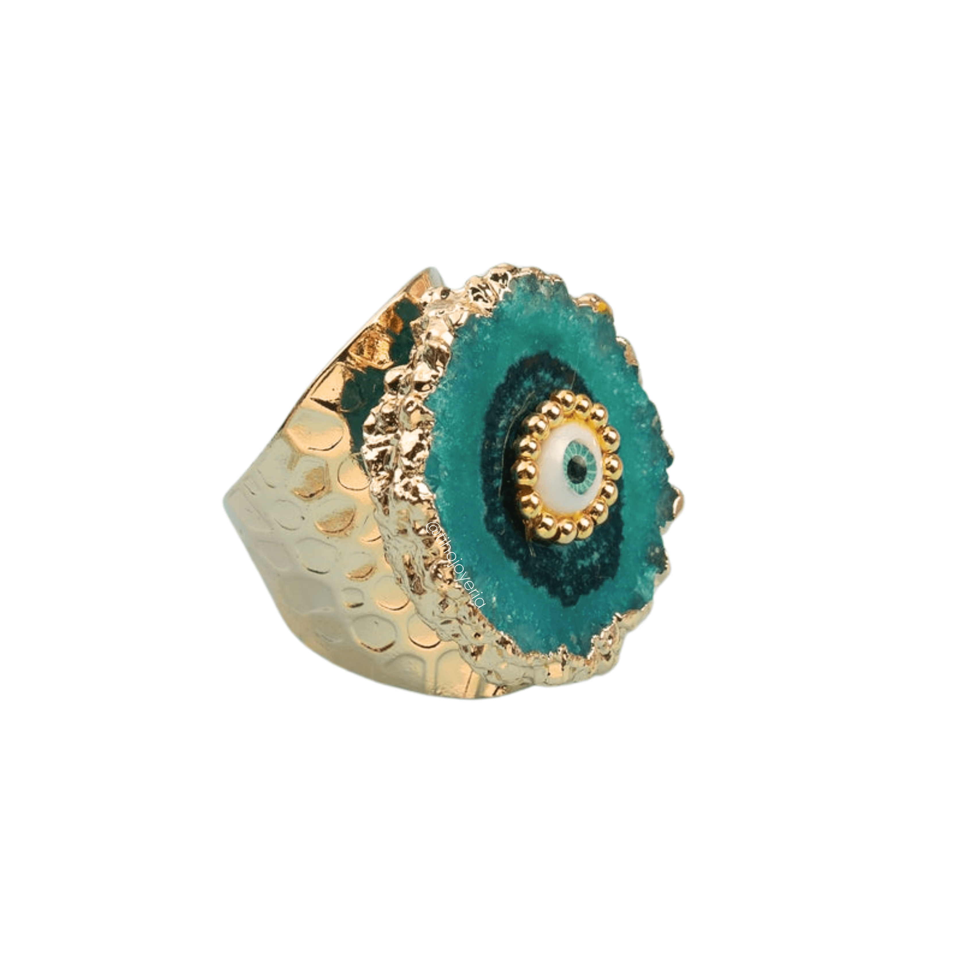 Un anillo lleno de energía y presencia. Su piedra en tonos morados con efecto geoda y detalle de ojo protector crea un look poderoso, místico y completamente único.